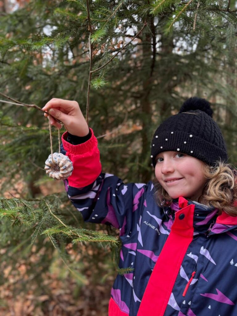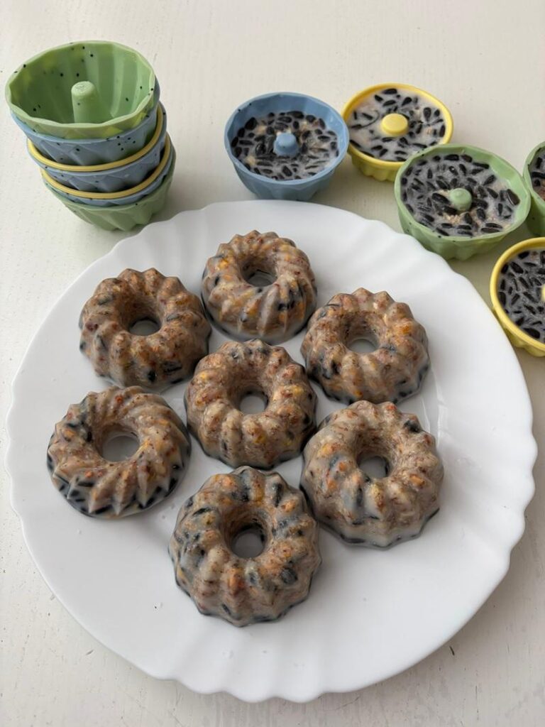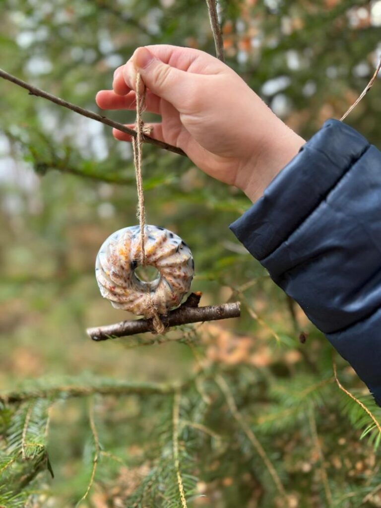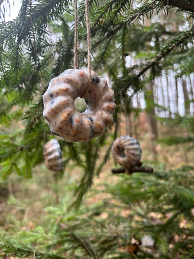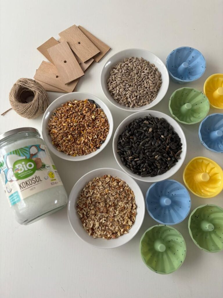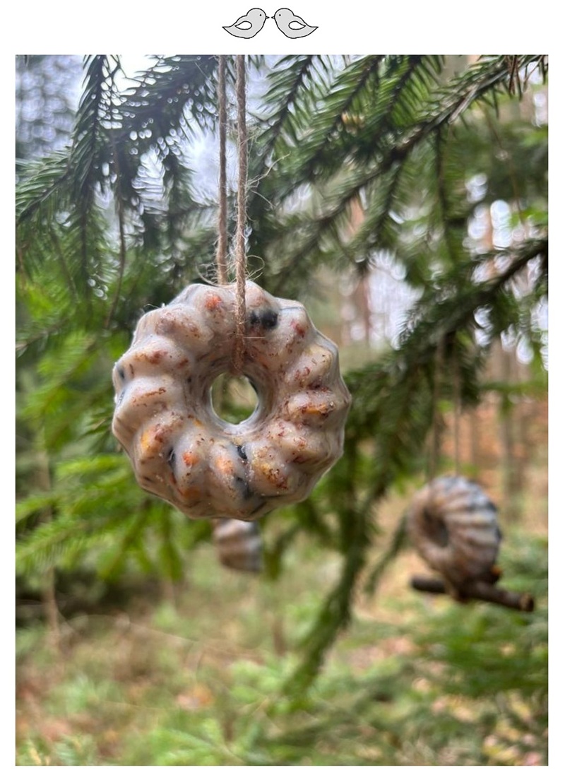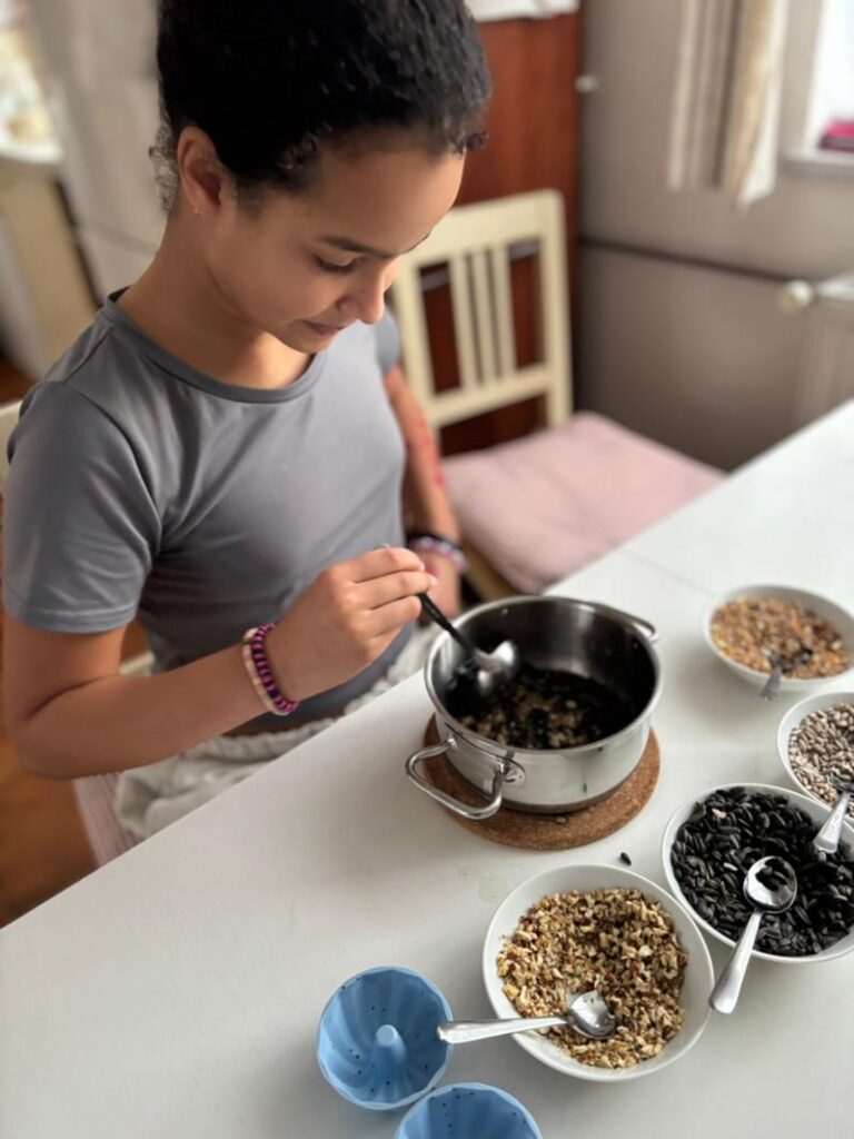 Semínka jsme smíchaly s kokosovým olejem, nalily do forem na bábovičky a nechaly ztuhnout. Teď už se pohupují na stromech a čekají na ptačí zobáčky…