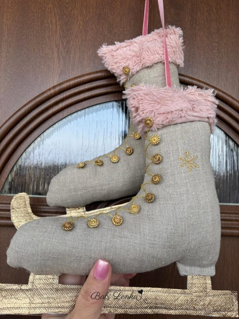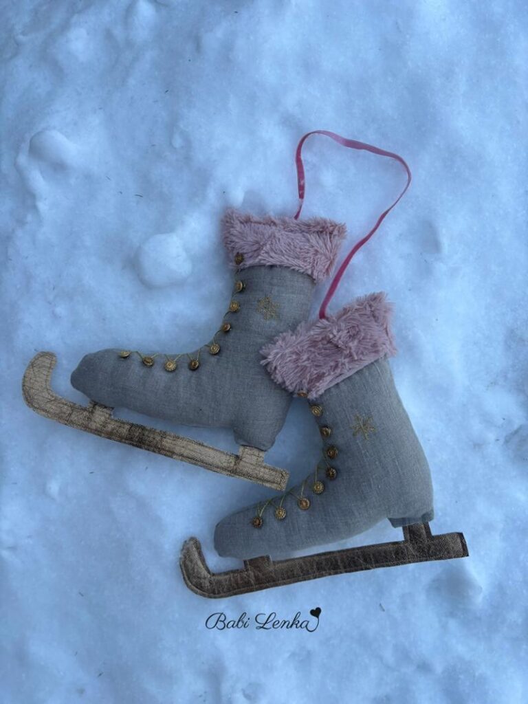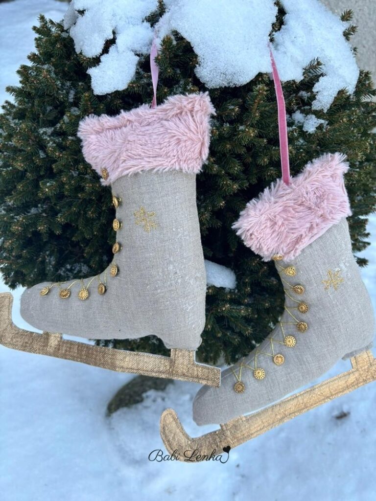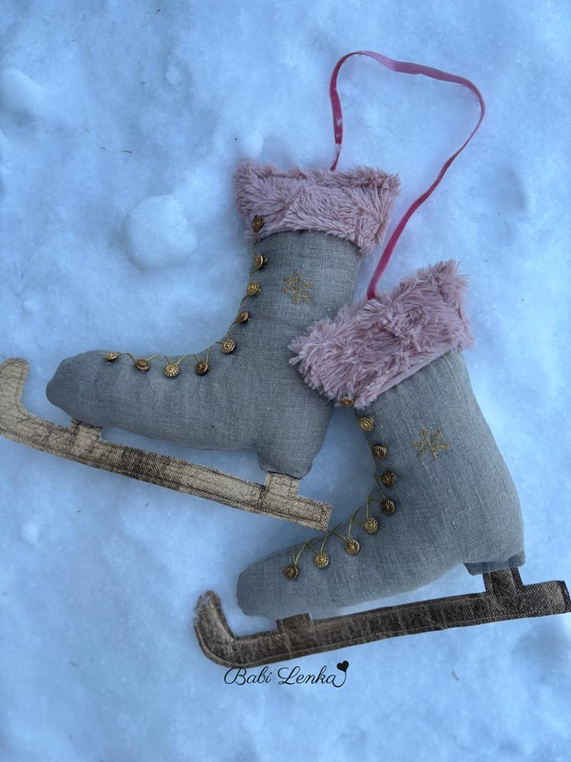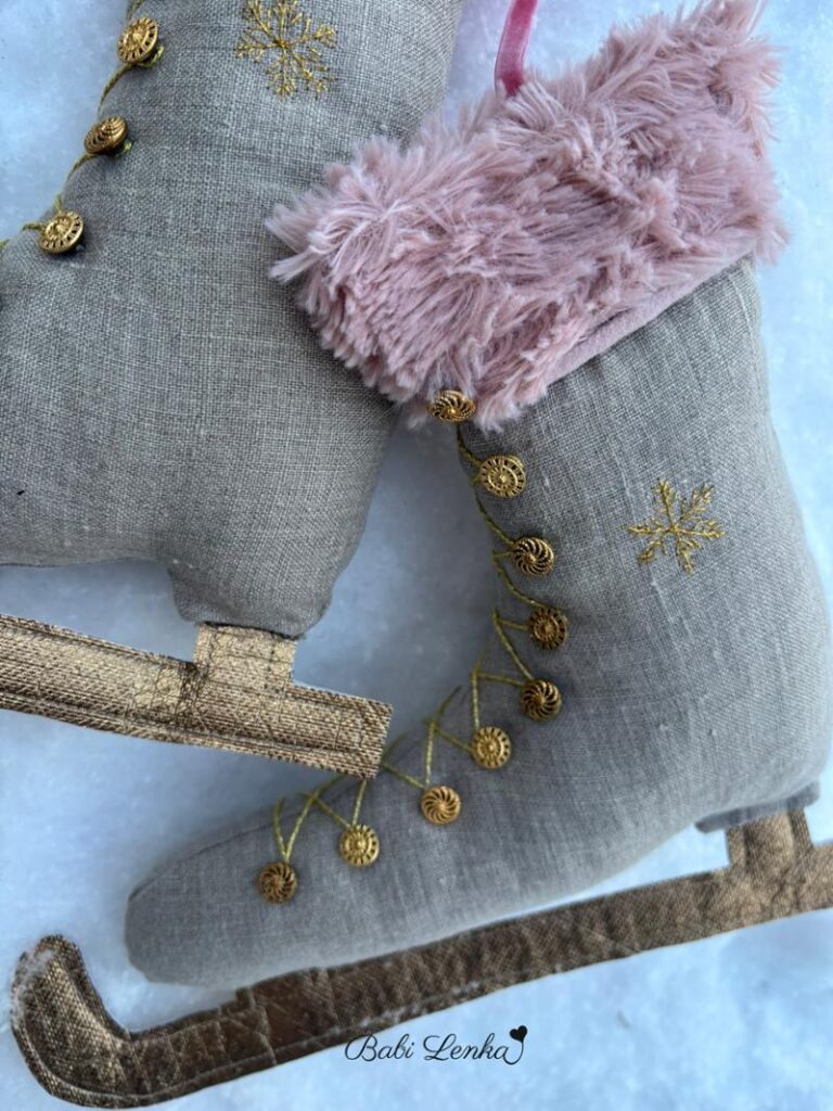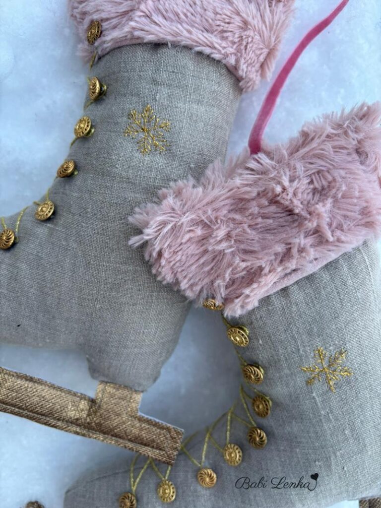 Jsou ze zbytků lněné látky, s hebkou růžovou kožešinkou ze starého polštáře , doplněné starožitnými knoflíčky po babičce a výšivkou sněhových vloček. Obyčejná zimní dekorace, ze které mám radost…